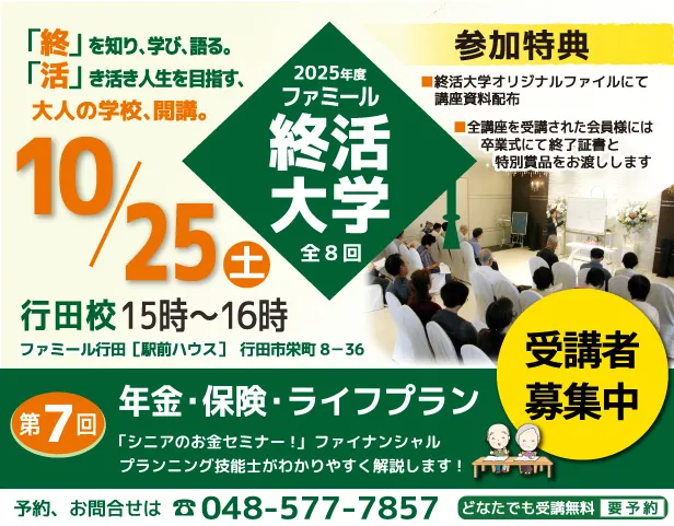 行田市で終活の正しい情報と知識を学ぶ!「第7回・ファミール終活大学」10月25日(土)開講!