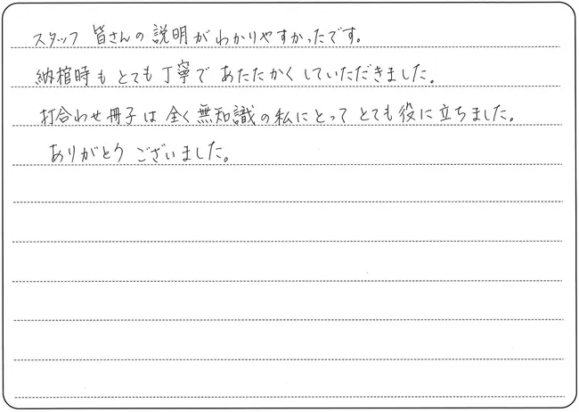 Home 実績と絆 実績と絆 行田市葬儀 お客様の声「ファミール行田〔行田市斎場〕」 2025年11月19日 【F様より】 スタッフ皆さんの説明がわかりやすかったです。 納棺時もとても丁寧であたたかくしていただきました。 打合わせ冊子は全く無知識の私にとってとても役に立ちました。 ありがとうございました。 ■施行させていただいた葬儀事例 項目 詳細 葬儀プラン 行田市民葬/ スーペリアコース 参列人数 30名 宗派 真言宗 式場名 行田市斎場 式場の地域 行田市 安置場所 行田市内自宅 火葬場 行田市斎場 担当者 田尻 昌久 カテゴリー 行田 熊谷 タグ 火葬式(直葬) 一日葬 市民葬 家族葬 最近の投稿 行田市葬儀 お客様の声「ファミール行田〔行田市斎場〕」 熊谷市葬儀 お客様の声「ファミール熊谷〔家族ルーム〕」 行田市葬儀 お客様の声「ファミール行田〔行田市斎場〕」 熊谷市葬儀 お客様の声「ファミール熊谷 〔石原ホール〕」 行田市葬儀 お客様の声「ファミール行田〔行田市斎場〕」 全月別アーカイブ 2025年11月 (2) 2025年10月 (8) 2025年9月 (4) 2025年8月 (3) 2025年7月 (4) 2025年6月 (4) 2025年5月 (5) 2025年4月 (2) 2025年3月 (4) 2025年2月 (3) 2025年1月 (4) 2024年12月 (3) 2024年11月 (2) 2024年10月 (1) 2024年9月 (1) 2024年8月 (1) 2024年7月 (1) 2024年6月 (1) 2024年5月 (1) 2024年4月 (2) 2024年3月 (1) 2024年2月 (1) 2024年1月 (2) 2023年12月 (4) 2023年11月 (1) 2023年10月 (2) 2023年9月 (5) 2023年8月 (1) 2023年7月 (1) 2023年6月 (2) 2023年5月 (1) 2023年4月 (2) 2023年2月 (1) 2023年1月 (3) 2022年12月 (2) 2022年11月 (2) 2022年10月 (1) 2022年9月 (7) 2021年10月 (1) 2021年8月 (1) 2021年7月 (1) 2021年6月 (3) 2021年3月 (10)