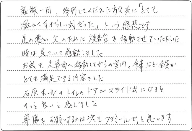 お式も火葬場へ移動してからの案内、食事など全員がとても満足できる内容でした。