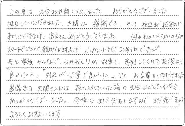 この度は、大切なお母様のお見送りをお任せいただき、本当にありがとうございました。