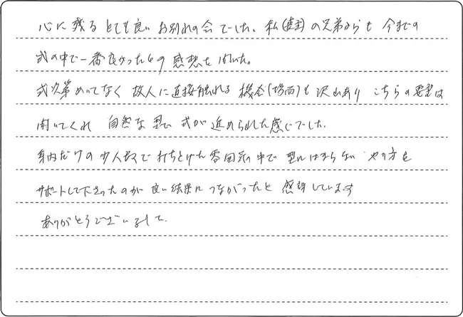 私(喪主)の兄弟からも今までの式の中で一番良かったとの感想を聞いた。