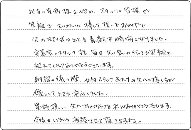 納棺の儀の際、女性スタッフふたりの父への接し方が優しくてとても安心しました。
