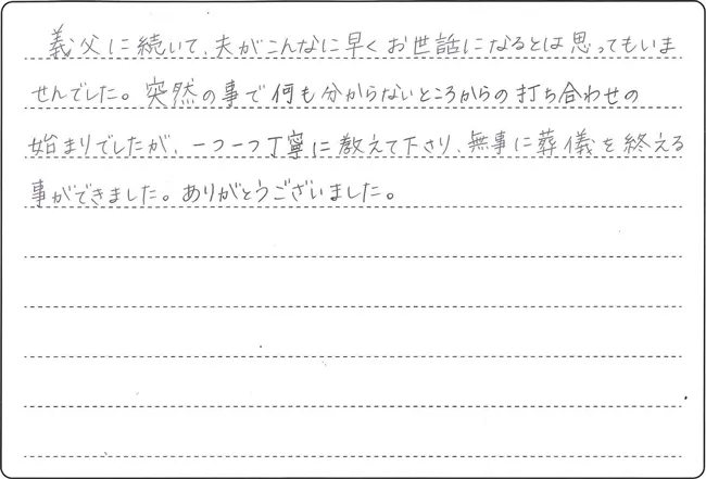 この度は、お義父様に続き、ご主人様との大切なお別れの場を私共にお任せいただき、誠にありがとうございました。