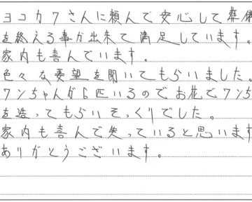 【T様より】ヨコカワさんに頼んで安心して葬儀を終える事が出来て満足しています。家内も喜んでいます。色々な要望を聞いてもらいま…