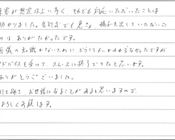 【K様より】来客が想定以上に多く、それでも対応いただいたことは助かりました。告別式でも急きょ、椅子を出していただいたのはありが…