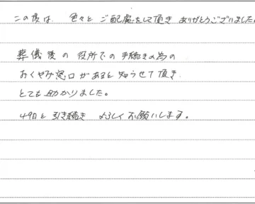【Y様より】この度は、色々とご配慮をして頂きありがとうございました。葬儀後の役所での手続きの為のおくやみ窓口があると知らせて頂…