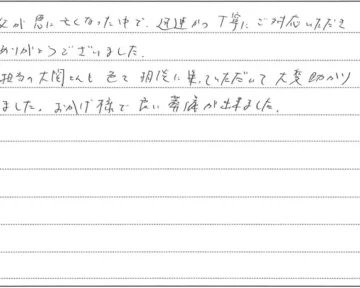 【Y様より】父が急に亡くなった中で、迅速かつ丁寧にご対応いただきありがとうございました。担当の大関さんも色々相談に乗っていただ…